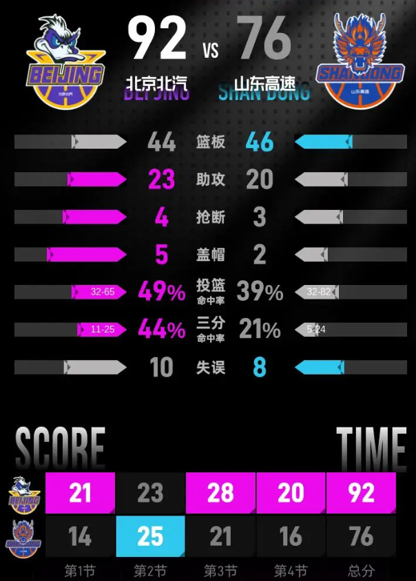 第四节开始后,范子铭率先命中三分,北京北汽延续进攻势头打出一波小高潮,分差迅速扩大到20分以上。杰曼接助攻命中三分后,周琦接助攻灌篮得分,分差来到26分,山东高速换下主力球员调整。珀塞尔跳投得分打破得分荒,陶汉林接助攻上篮得手,杰曼两次上篮稳住优势,谢智杰、郭凯连续追分,谢智杰再添抛投,贝利上篮命中后,山东高速王证、谢智杰先后命中三分,最终北京北汽客场92-76击败山东高速。