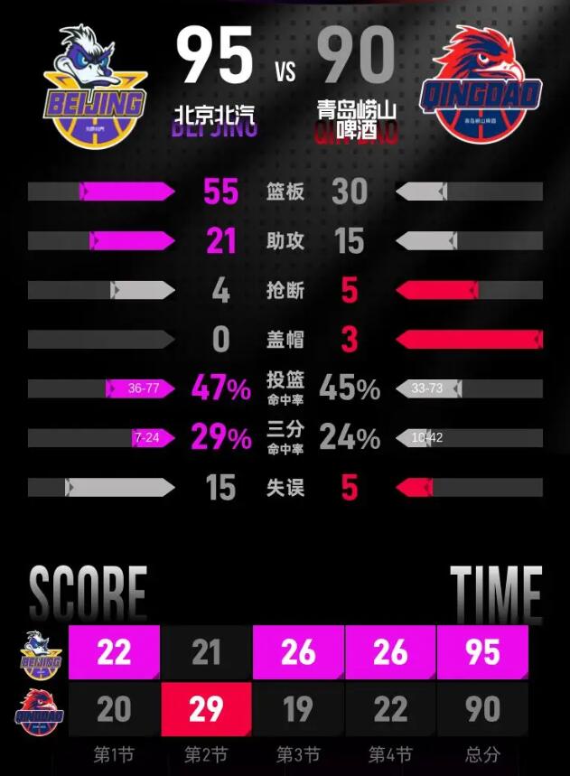 比赛进入末节,奎因奥内斯上篮得分重新拿回领先,麦基跳投加罚球再次反超,双方再次战平后,杰曼和翟晓川连续进攻得分,北京北汽逐步拉开分差,领先达到9分。段昂君命中三分,赵嘉义上篮得分,青岛队不断缩小分差,杰曼回应上篮再中三分,重新把分差拉到8分。奎因奥内斯不甘示弱,最后一分钟内上篮得分,再命中三分把分差缩小到4分,雷蒙上篮得分后,青岛罚球命中,奎因奥内斯跳投再追两分,最后5秒翟晓川接助攻上篮命中,最终北京北汽95-90击败青岛崂山啤酒。