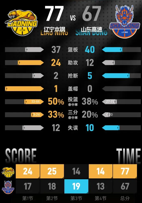 进入第四节,谢智杰上篮得分,郭凯罚中一球,山东把分差缩小到6分。鄢手骐接赵继伟助攻命中三分,付豪篮下得分,辽宁再次拉开分差。克里斯两罚全中追分,赵继伟跳投命中,姜宇星上篮得分,辽宁领先13分。珀塞尔两罚一中再跳投得分,分差回到10分。付豪篮下得分后,谢智杰投进三分把分差缩小到9分,鄢手骐立刻回敬三分稳住进攻局势。最后时刻陶汉林上篮得分,山东没能继续缩小分差,最终辽宁客场带走胜利。