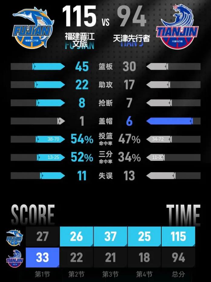 北京时间1月10日,2025-26赛季CBA常规赛天津客场对阵福建,福建借助3人得分20+的出色表现,持续压制福建逐步扩大20+领先优势,最终福建115-94战胜天津结束3连败,天津遭遇2连败。 数据... 天津 福建