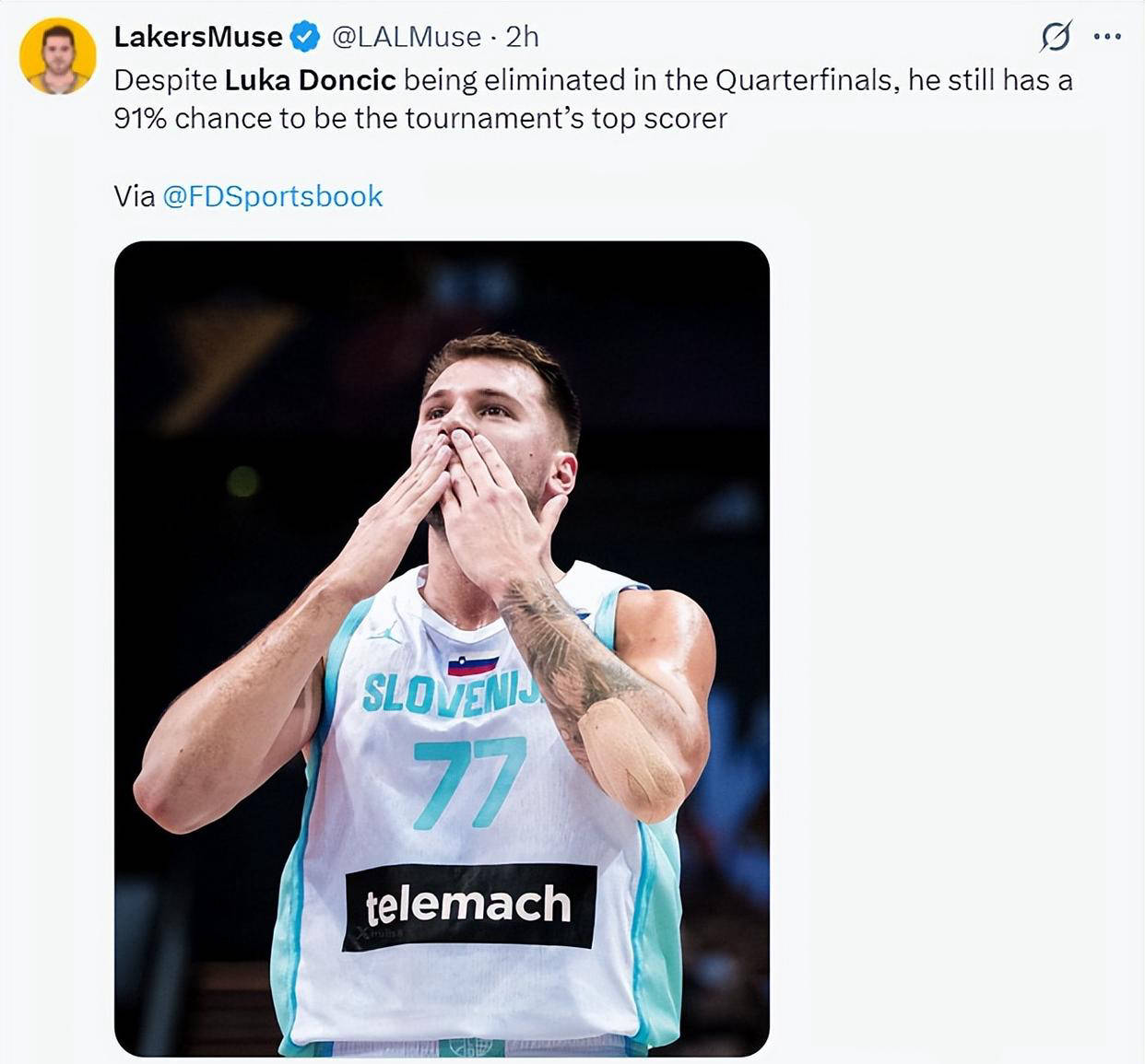 湖人的媒体指出,尽管东契奇未能带领斯洛文尼亚队杀入半决赛和决赛,但根据数据显示,他仍有91%的机会成为本届欧洲杯的得分王。