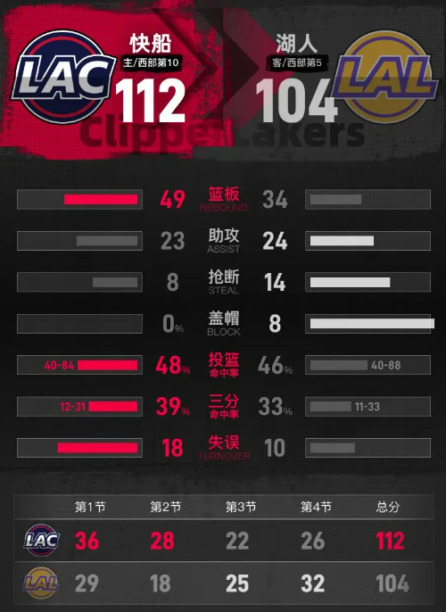 第四节,湖人发起反击,将分差缩小至2分,展现出强烈的求胜欲望。然而,在比赛的关键时刻,快船顶住压力,保持高效的进攻节奏,稳步扩大自己的优势。最终,快船以112-104赢下比赛,成功锁定胜局。