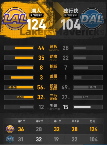 在第四节开始,湖人再次经历了手感不佳,双方分差降至12分。随着比赛的推进,湖人逐步找回状态,展开一波22分的进攻高潮,拉开分差。虽然独行侠在小节后段奋起直追,但最终无力回天。比赛结束时,湖人以124-104赢得胜利。