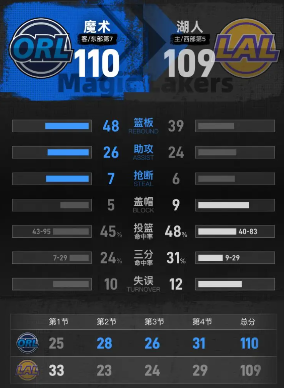 魔术队:班凯罗36分10篮板6助攻、贝恩22分1篮板6助攻、卡特20分12篮板2助攻、席尔瓦13分6篮板3助攻、布莱克8分4篮板4助攻、霍华德4分4篮板1助攻、瓦格纳4分3篮板1助攻、艾萨克3分4篮板3助攻、卡特4篮板。