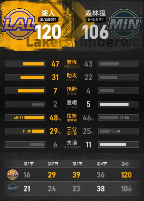 全场具体比分(湖人队在后):21-16、24-29、23-39、38-36。