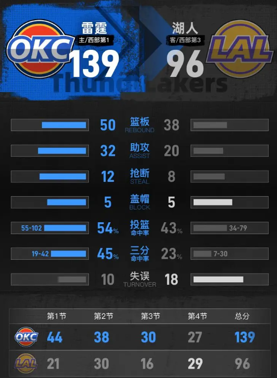 雷霆半场进攻多点开花,效率极高,早早建立起超过30分的领先优势,湖人进攻端状态低迷,比赛早早失去悬念。