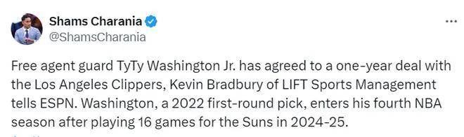 爆料王Shams:小泰泰-华盛顿已经同意和快船签约一份1年合同。