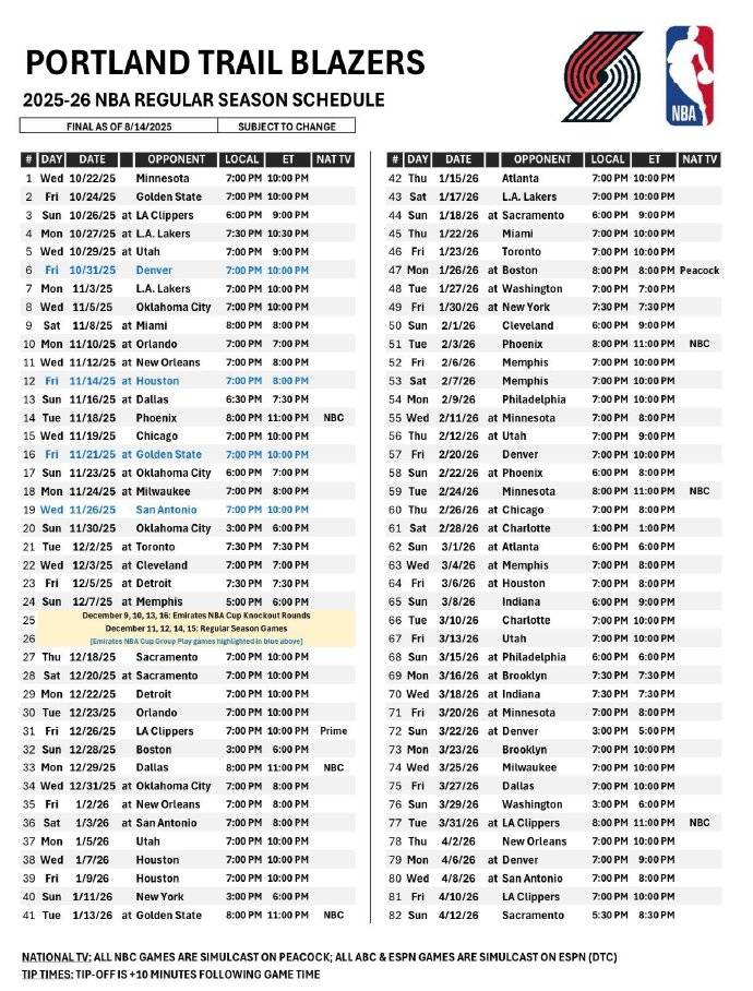 北京时间2025年8月15日,NBA官方公布了新赛季赛程,开拓者赛程及全美直播场次也随之出炉。