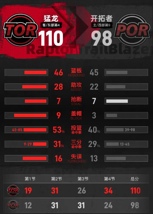 全场具体比分(开拓者队在后):19-12、31-31、26-31、34-24。
