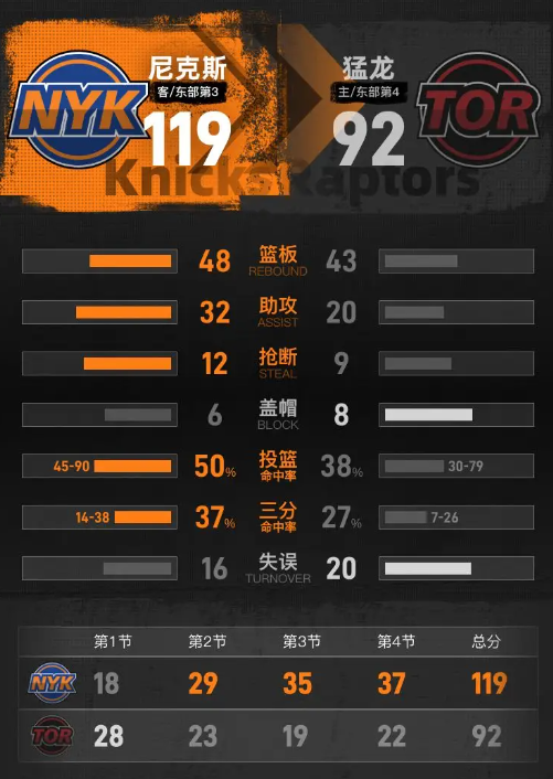 第四节,猛龙在小节初期努力尝试缩小分差,将比分追至72-82,但尼克斯迅速做出反应,通过一波进攻将分差扩大至27分。虽然后来猛龙再度奋起直追,逐步拉近分差,而尼克斯的哈特得到11分,包括3记三分球。最终,第四节结束,尼克斯以119-92赢得比赛。
