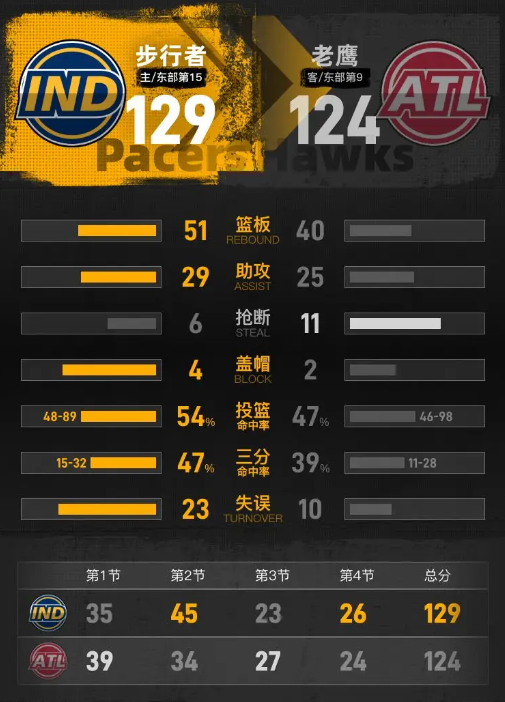 全场具体比分(步行者队在后):39-35、34-45、27-23、24-26。