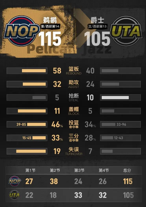 最后一节开始,爵士展开强烈反击,一度将分差缩小至7分,试图重燃胜利希望。然而,鹈鹕随即通过一波高效进攻重夺主动权,维持了他们的领先优势。本节比赛,爵士的科利尔同样表现出色,砍下12分。终场哨响,鹈鹕以115-105赢下比赛。