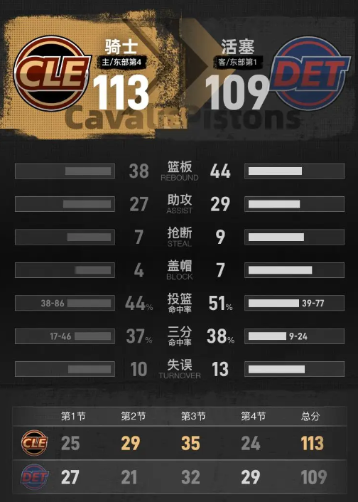 最后一节,骑士队延续了良好的状态,开局便打出一波进攻将领先优势扩大至11分。活塞队随后展开反击,将分差缩小至1分,形势趋于紧张。尽管如此,骑士队在后段保持了稳定的进攻节奏,逐步扩大优势,最终以113-109赢得比赛。
