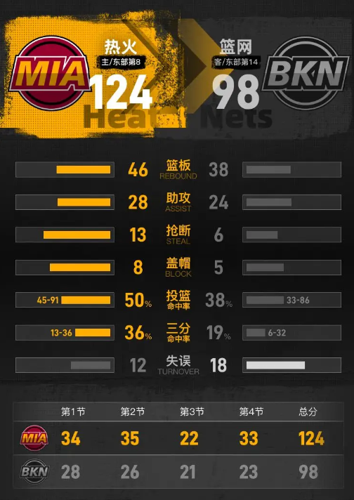 阿德巴约23+9+4希罗22分哈克斯20分 热火送篮网9连败