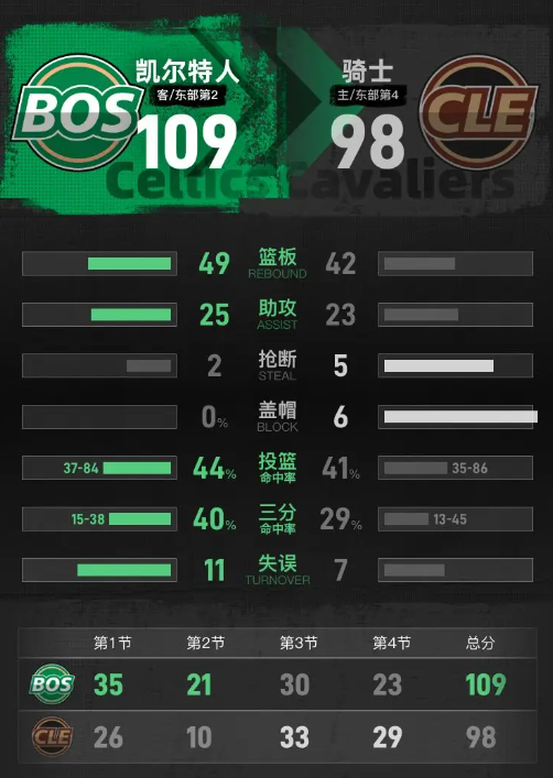 凯尔特人半场掌控进攻节奏,骑士单节仅得到10分,分差被拉开到20分以上,凯尔特人占据场上主动。