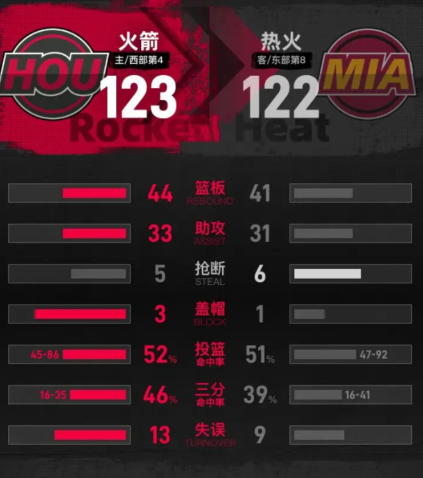 北京时间3月22日NBA常规赛,主场作战的火箭以123-122击败热火,热火遭遇4连败。汤普森24分18篮板4助攻,阿德巴约32分21篮板4助攻。