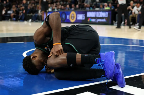 比赛第二节,爱德华兹在一次防守中左膝受伤,痛苦倒地,随后被搀扶离场。
